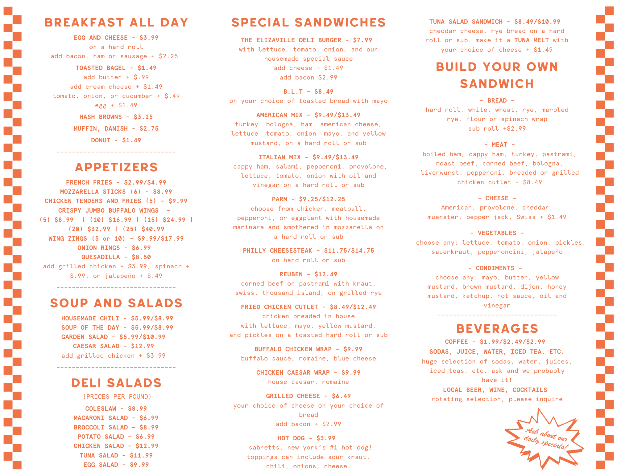 The Elizaville Deli is a community hub in Elizaville, New York, in the heart of the Hudson Valley. Serving up American comfort food, classic deli sandwiches, pizzas, soups, salads, great coffee, handcrafted cocktails, local beer, wine, and cider, as well as all the convenience store staples – we have what you need! Come for breakfast, lunch, or dinner – dine in, delivery, or pick up!
